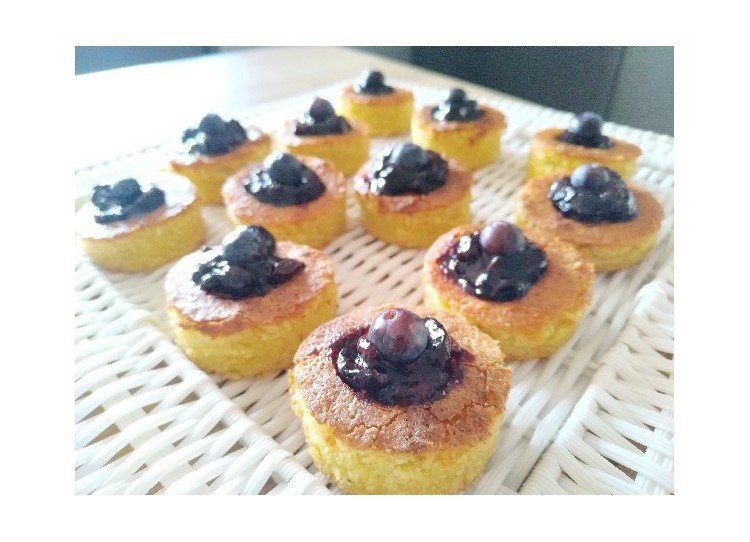 Et cette semaine, ce sera de délicieux petits gateaux sur base amande avec un coulis de myrtilles